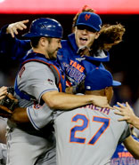 Los neoyorquinos celebran el triunfo de 3-2 sobre los Dodgers. Daniel Murphy fue el héroe al robar una tercera base desguarecida y anotar la carrera del empate. Luego pegó un jonrón Foto Ap