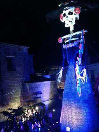 Una catrina de 18.7 metros de altura fue certificada como la estructura monumental en su tipo más grande en el mundo. La pieza es el atractivo principal de la exposición por el Día de Muertos en Zapotlanejo, Jalisco. Está hecha de alambrón, plástico, 200 metros de tela y flores, y tiene un peso de 600 kilogramos Foto La Jornada