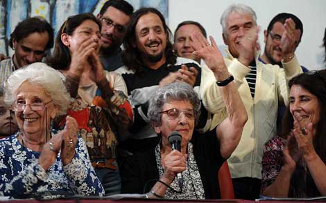 Delia Giovanola (centro), abuela materna de Martín, el nuevo nieto recuperado, agradece los aplausos tras el anuncio que realizó Estela de Carloto, presidenta del organismo argentino (izquierda), sobre el caso. El joven, quien vive desde hace 15 años en el extranjero, es hijo de Estela Maris Montesano y Jorge Óscar Ogando, militantes del Partido Revolucionario de los Trabajadores, quienes fueron secuestrados y desaparecidos el 16 de octubre de 1976 por la dictadura militar. Él mismo se acercó a la organización, pues tenía sospechas de ser hijo de desaparecidos Foto Afp