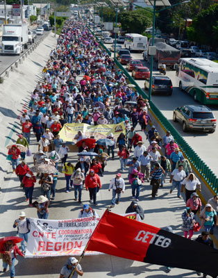 Maestros de la CNTE se manifestaron ayer en Guerrero y Chiapas contra la reforma educativa. En Chilpancingo (imagen), los inconformes derribaron la puerta del estacionamiento del Congreso local, pintaron paredes y rompieron algunos ventanales; más tarde bloquearon durante una hora la Autopista del Sol México-Acapulco en ambos sentidos Foto Cuartoscuro