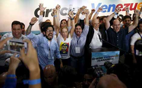 Lilian Tintori (centro), esposa del dirigente opositor encarcelado Leopoldo López, celebra con candidatos de la coalición Mesa de la Unidad Democrática (MUD) en una conferencia de prensa en Caracas, tras conocerse los resultados electorales favorables a ese frente político Foto Reuters