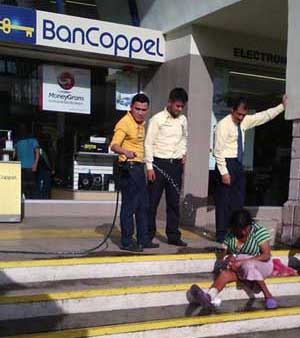 Tres empleados de una sucursal de la empresa Coppel en Tepic, Nayarit, insultaron y arrojaron agua a una pareja (en la imagen aparece sólo la mujer) que estaba sentada y comía en las escalinatas del establecimiento, para que se retirara del lugar. La escena fue captada por el periodista Heriberto Villela, quien la difundió en redes sociales; el acto clasista causó enorme rechazo ciudadano. El gobernador Roberto Sandoval ordenó una investigación y más tarde la Fiscalía General del Estado aseguró la tienda y los trabajadores fueron citados a declarar. Los afectados recibieron apoyo de esa dependencia en el área de Atención a Víctimas Foto Heriberto Villela