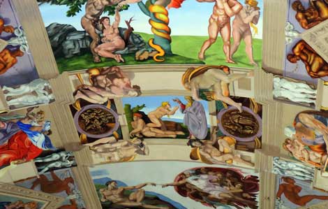 Miguel Francisco Macías, jubilado de 71 años, ha trabajado durante casi 15 en reproducir en la bóveda de la parroquia del Perpetuo Socorro, en la capital del país, la famosa pintura de Miguel Ángel con lienzos de 15 por 3 metros que ha ido pegando poco a poco. Sin apoyos ni recursos económicos oficiales, apenas con la bendición del clero y esporádicas palmaditas del arzobispo primado Norberto Rivera Carrera, la obra lleva un avance de 80 por ciento. No sabía en la que me metía, confiesa el diseñador gráfico, quien nunca tomó un curso de pintura Foto Mónica Mateos-Vega