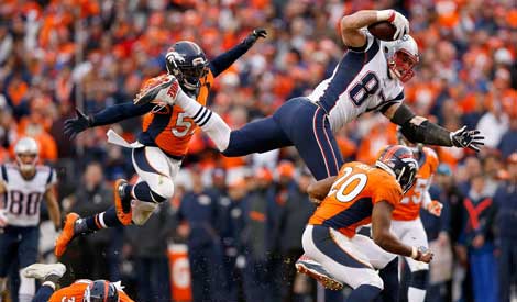 Con su defensiva como baluarte, los Broncos de Denver, comandados por el veterano Peyton Manning, consiguieron dramático triunfo de 20-18 sobre los favoritos Patriotas de Nueva Inglaterra, al interceptar el envío de Tom Brady para la conversión de dos puntos y empate cuando quedaban 12 segundos de juego. En la imagen, el ala cerrada de los Pats, Rob Gronkowski, tras la captura de un pase en el último cuarto. En la contienda por la Conferencia Nacional, las Panteras de Carolina apalearon 49-15 a los Cardenales de Arizona y consiguieron el boleto para la gran final, la cual se llevará a cabo en San Francisco el 7 de febrero Foto Afp