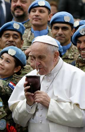 El papa Francisco bebió un poco de mate, la tradicional bebida sudamericana, que le fue ofrecida por soldados de la Organización de Naciones Unidas al final de su audiencia general en la Plaza de San Pedro Foto Ap