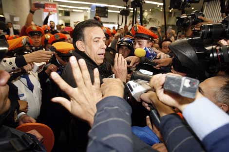 Humberto Moreira, ex gobernador de Coahuila y ex presidente del PRI, arribó en la noche de ayer al aeropuerto capitalino, procedente de España, en medio de un fuerte dispositivo de seguridad. Entre empujones dio sus primeras declaraciones a medios de comunicación Foto Cristina Rodríguez