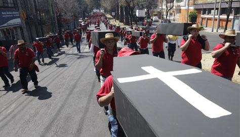 Integrantes de la organización Familia Pasta de Conchos, del Centro de Derechos Humanos Miguel Agustín Pro Juárez, del Observatorio Eclesial y deudos de los mineros fallecidos hace 10 años durante una explosión en el yacimiento, propiedad de Grupo México, recordaron con una misa la tragedia que dejó 65 trabajadores muertos; los restos de 63 continúan en el socavón. Por su parte, el sindicato minero exigió al gobierno el rescate de los cuerpos, indemnización para los familiares y garantías políticas que permitan el regreso a México de su dirigente, Napoleón Gómez Urrutia. La imagen, durante una marcha en la capital del país para demandar justicia Foto Yazmín Ortega Cortés