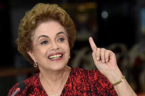 La presidenta de Brasil, Dilma Rousseff, durante una conferencia de prensa en el Palacio de Planalto. El juez Sergio Moro, encargado del proceso sobre las investigaciones de corrupción en Petrobras, divulgó ayer una llamada entre la mandataria y Luiz Inacio Lula da Silva, la cual abordaba el envío del decreto de nombramiento del ex presidente en el gabinete para ser usado sólo si es necesario Foto Afp
