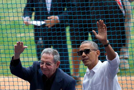 Los presidentes Raúl Castro y Barack Obama saludan al público que acudió al partido de exhibición entre la selección cubana de beisbol y el equipo estadunidense Mantarrayas de Tampa Bay, el cual ganó este último 4-1. También asistieron 40 guerrilleros de las FARC, encabezados por su líder Rodrigo Londoño, Timochenko, que negocian en La Habana con el gobierno de Juan Manuel Santos un acuerdo de paz Foto Ap