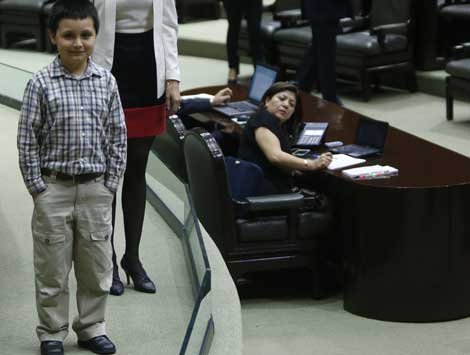 Carlos Antonio Santamaría Díaz, de nueve años, quien se graduó en un diplomado en la Facultad de Química de la UNAM, visitó ayer la Cámara de Diputados Foto Francisco Olvera