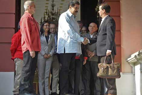El presidente de Venezuela, Nicolás Maduro, saluda en el Palacio de Miraflores a Frank Pearl, representante del gobierno colombiano, mientras a sus espaldas atestigua Antonio García, por el Ejército de Liberación Nacional, tras el anuncio en Caracas del inicio de un proceso de paz con mesa de negociaciones en Ecuador, además de la realización de diálogos en otros cuatro países latinoamericanos Foto Afp