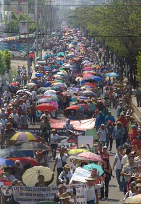 Miles de maestros, estudiantes, padres de familia e integrantes de organizaciones sociales se manifestaron ayer en la capital chiapaneca para exigir la liberación de seis profesores y dos personas ajenas al movimiento magisterial, detenidos durante los enfrentamientos con la policía el pasado miércoles Foto Víctor Camacho