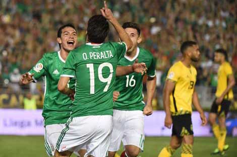La selección mexicana amarró su boleto a la siguente ronda al vencer 2-0 a Jamaica, con goles de Javier Chicharito Hernández, al minuto 18, y de Oribe Peralta, al 81 (imagen). El equipo caribeño falló varias oportunidades de anotar por su mala puntería y por la buena actuación del portero Guillermo Ochoa. El próximo lunes México dirimirá el liderato del grupo ante Venezuela Foto Afp