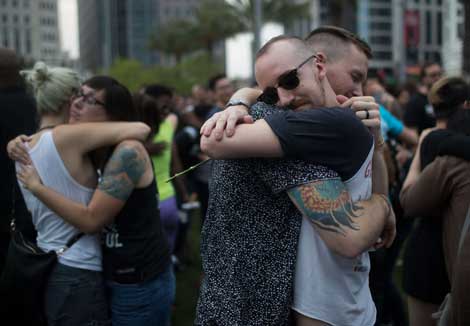 Cientos de personas se reunieron en el Centro de Artes Escénicas Dr. Phillips, en Orlando, Florida, para realizar una ceremonia de duelo en memoria de las víctimas del ataque al club nocturno gay Pulse, el pasado domingo Foto Afp