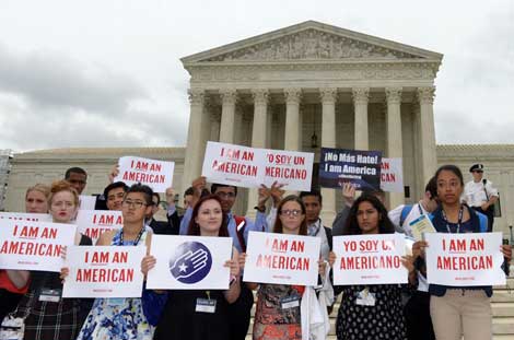 Plantón en Washington frente a la Suprema Corte de Estados Unidos, donde ayer se resolvió mantener fallos judiciales en Texas y otros 25 estados para frenar el plan migratorio del presidente Barack Obama, que ofrecía protección temporal a casi 5 millones de indocumentados Foto Xinhua