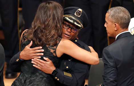 El presidente Barack Obama asistió ayer al funeral de los cinco policías asesinados en Dallas, Texas, el pasado día 9 por un francotirador. Aceptó que a pesar del progreso en las relaciones raciales de la nación, la parcialidad continúa. Pidió a los estadunidenses estar unidos y afirmó que más allá de estos hechos de violencia, el país no está tan dividido como parece. También asistió a la ceremonia el ex presidente republicano George W. Bush, quien calificó a los caídos de las mejores personas entre nosotros. En la imagen, Michelle Obama ofrece sus condolencias al jefe de la policía de aquella ciudad, David Brown Foto Ap