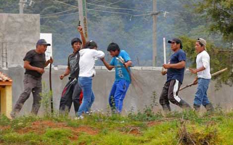 Armadas con machetes, palos e incluso armas de fuego, unas 200 personas originarias de San Juan Chamula y locatarios de mercados identificados con el PVEM, algunos encapuchados, arremetieron contra las instalaciones del bloqueo que diversas organizaciones mantenían en la carretera de cuota San Cristóbal de las Casas-Tuxtla Gutiérrez. Posteriormente prendieron fuego al campamento. Maestros y padres de familia responsabilizaron de los hechos al gobierno estatal. En la imagen, policías y atacantes rodean a Dolores Rodríguez, reportera del Noticiero Redes, a quien amenazaron con una pistola