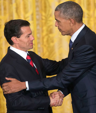 Entre los temas que Enrique Peña Nieto y Barack Obama abordaron ayer está el fortalecimiento del diálogo económico de alto nivel. En la imagen, los presidentes tras la conferencia de prensa que ofrecieron en la residencia oficial del mandatario estadunidense Foto Ap