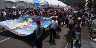 Integrantes de la CNTE realizaron un mitin frente a Palacio Nacional, para después llevar a cabo una caminata alrededor del circuito de la Plaza de la Constitución. En la imagen, los mentores pasan frente a las instalaciones de la llamada Aldea Digital Foto Francisco Olvera