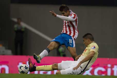 Guadalajara goleó 3-0 al América en el clásico mexicano disputado anoche en el Azteca, gracias a un doblete y una asistencia de Isaac Brizuela, quien en la imagen pelea por el balón con Paolo Goltz, en la séptima jornada del torneo Apertura 2016. Con su triunfo, las Chivas llegaron a 11 puntos, para subir del undécimo al séptimo lugar, mientras las Águilas se quedaron en el quinto sitio Foto Ap