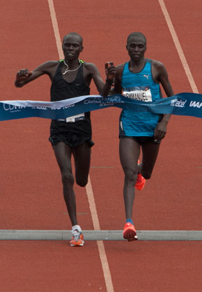 El keniano Emmanuel Mnangat (derecha) ganó ayer el Maratón de la Ciudad de México (2:19.30) al tocar con el pecho la cinta de la meta antes que su compatriota Isaak Kemboii, que cronometró tiempo similar. En la rama femenil, la lituana Diana Lobacevske conquistó el podio con 2:40.31 Foto Cristina Rodríguez