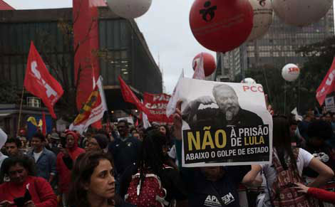 Miles de integrantes de agrupaciones sindicales y movimientos sociales se manifestaron en al menos 16 entidades del país sudamericano en protesta por las reformas laboral y al sistema de pensiones impulsadas por el presidente Michel Temer. En la movilización en Sao Paulo (imagen) los trabajadores desplegaron imágenes en apoyo al ex mandatario Luiz Inácio Lula da Silva, acusado de corrupción Foto Xinhua