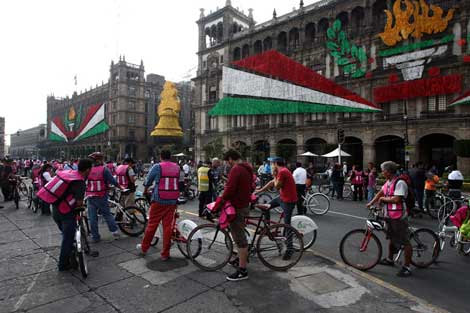 Decenas de ciclistas y peatones se congregaron en el Zócalo para la celebración. El jefe de Gobierno, Miguel Ángel Mancera, y colaboradores llegaron a sus oficinas en taxi eléctrico, Metro o caminando a fin de incentivar a la gente a dejar su vehículo. Sin embargo, fuera de esa zona, donde se restringió el acceso de automotores, en la mayor parte de la ciudad hubo problemas de tráfico y congestiones Foto Marco Peláez
