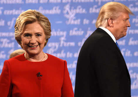 Los candidatos de los partidos Demócrata, Hillary Clinton, y Republicano, Donald Trump, abandonan el escenario tras concluir su primer debate en la Universidad Hofstra, en Long Island, Nueva York Foto Afp