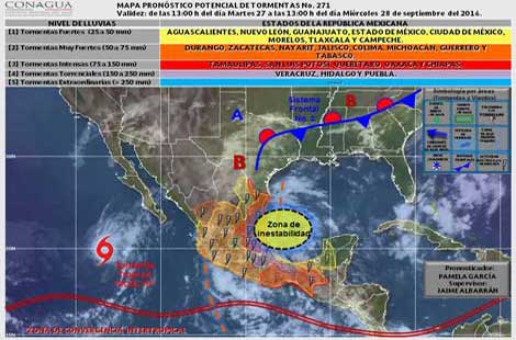 El Servicio Meteorológico Nacional informó que tres sistemas se presentan en forma simultánea en el territorio. En el Golfo de México hay un fenómeno con potencial de convertirse en ciclón, al igual que en el océano Pacífico, y enmedio existe otro que impulsa el frente frío número dos. Advierte que esa situación provocará lluvias torrenciales en Veracruz, Hidalgo y Puebla Imagen tomada del portal de Conagua
