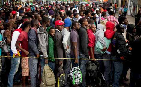 Cientos de ciudadanos de esa nación caribeña que buscan asilo en Estados Unidos hacen fila frente a un módulo del Instituto Nacional de Migración. Decenas de ellos duermen a la intemperie frente a esa oficina y otras zonas ante la saturación de albergues de grupos de apoyo. Organizaciones no gubernamentales exigieron que se decrete una crisis humanitaria y la Federación auxilie a los extranjeros. El gobernador Francisco Vega de Lamadrid afirmó que la manutención de cada haitiano le cuesta a Baja California entre 150 y 200 pesos diarios Foto Afp