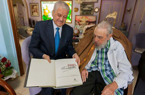 Fidel Castro se reunió ayer en su domicilio particular de La Habana con el primer ministro de Argelia, Abdelmalek Sellal, con quien recordó momentos históricos entre ambos países y llamó a la firmeza revolucionaria de los pueblos, en el contexto de una visita para celebrar medio siglo de estrecha relación bilateral. Durante el encuentro, el ex presidente de Cuba reiteró los retos que tiene ante sí la comunidad mundial para resguardar la paz y garantizar la alimentación y la existencia misma de la especie humana Foto Afp