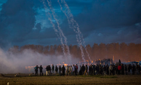 Policías antimotines franceses se enfrentan con gases lacrimógenos a migrantes del campamento conocido como la Jungla, en Calais, donde se hacinan al menos 6 mil 500 indocumentados. Las autoridades anunciaron que mañana empezará el desmantelamiento del área, tras un acuerdo con el gobierno de Gran Bretaña, que se comprometió a recibir a todos los adolescentes que demuestren tener familiares en ese país. El resto de los ocupantes serán llevados a centros de refugio en toda Francia. Organismos humanitarios consideran que es urgente desalojarlos antes de invierno Foto Ap