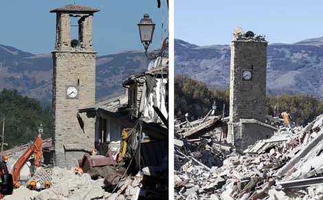 Un sismo de magnitud 6.5 se produjo a las 7:40 horas locales en el Parque Nacional de los Montes Sibilinos, una zona montañosa entre las regiones de Umbría y Las Marcas. El fenómeno provocó graves daños en viviendas y edificios históricos, pero no se reportaron víctimas mortales. Muchas ciudades y pueblos ya habían sido desalojados después de los temblores registrados el pasado miércoles. En Amatrice, el campanario de una iglesia, que quedó en pie en otro movimiento telúrico ocurrido en agosto (izquierda), terminó ayer por colapsar Foto Ap