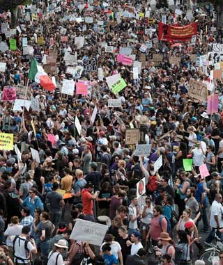 Decenas de miles marcharon este sábado en varias ciudades de Estados Unidos, incluyendo más de 10 mil frente a la Torre Trump, en Nueva York, con pancartas alusivas a la amenaza que representa el republicano contra los derechos de las mujeres, los inmigrantes y el planeta mismo. Según historiadores, en más de siglo y medio no se habían visto expresiones masivas de protestas contra un presidente electo. La imagen, en Los Ángeles Foto Afp