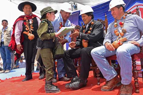 El presidente Evo Morales, con un casco de la YPFB, la empresa petrolera de Bolivia, y con un collar de tazas de barro en el cuello, hizo entrega de una estación satelital de regasificación y de más de 5 mil conexiones domiciliarias de gas licuado en la localidad de Villanzón. No faltó una alusión irónica sobre el próximo mandatario de Estados Unidos: ‘‘Ese caudillo trumposo, ¿cómo se llama? Es que no me acuerdo. ¿Trump?, ah sí, Trump’’ Foto Prensa Presidencial