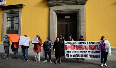 Habitantes del centro histórico de esa demarcación y de colonias del Pedregal de Santo Domingo bloquearon ayer calles y accesos a la sede delegacional en protesta por la excesiva mercantilización de los espacios públicos y el desbordamiento de romerías en esa zona, donde
