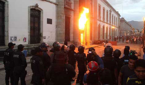 sólo es pasante. A las 14:30 horas un grupo de encapuchados desalojó a alumnos y trabajadores para posesionarse del edificio. La reyerta continuó y los ocupantes quemaron la puerta de acceso al plantel. Hubo intercambio de piedras, mobiliario y cohetones hasta que la policía estatal controló la situación Foto Jorge A. Pérez Alfonso