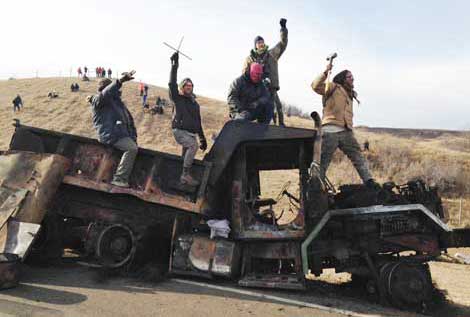 Opositores a la construcción de un oleoducto en Dakota del Norte se manifiestan sobre un vehículo que fue quemado cerca de Cannon Ball. Para la tribu siux, de la reserva india Standing Rock, la obra amenaza sus fuentes de agua potable y sitios donde fueron enterrados sus ancestros Foto Ap