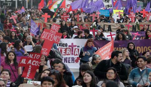 Con marchas, homenajes y mesas redondas, organizaciones civiles de al menos nueve entidades del país exigieron a las autoridades federales y estatales frenar los feminicidios. Para terminar con la cultura de la violencia de género, las mujeres deben decir ya basta al maltrato, señaló el presidente Enrique Peña Nieto, en el contexto del día internacional contra ese flagelo. La imagen, en la Ciudad de México, donde se manifestaron con cacerolas y cucharas en mano Foto Yazmín Ortega Cortés