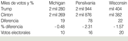 Los números divulgados hasta ahora, por el 2016 National Popular Vote Tracker (cookpolitical.com), en los tres estados en que se ha solicitado recuento son los siguientes: