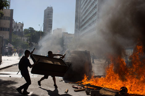 Manifestantes colocan una valla junto a una barricada en llamas a las afueras del Congreso local, en Río de Janeiro, donde legisladores votaban medidas de austeridad y acciones para enfrentar la crisis financiera. Cientos de burócratas y jubilados no han recibido o han recibido pagos a destiempo Foto Ap
