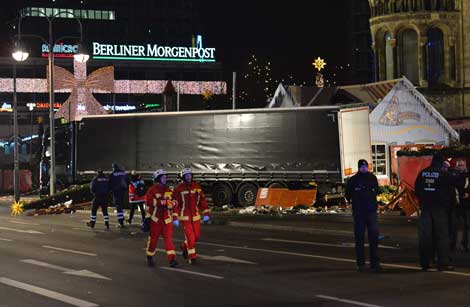 Todavía no está claro si fue un acto terrorista, pero hay indicios de que se trataría de un atentado islamita –que dejó también 50 heridos, algunos en extrema gravedad–, indicaron fuentes noticiosas alemanas. En la foto, bomberos y otros servicios de emergencia en el mercado, ubicado en una zona muy turística del oeste de Berlín, junto a la famosa iglesia en recuerdo del emperador Guillermo Foto Afp