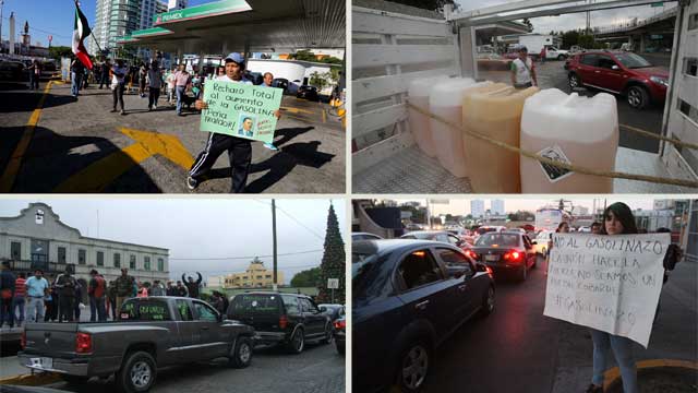Comerciantes, taxistas, transportistas y otros ciudadanos inconformes protestan en al menos nueve estados contra el incremento al precio de la gasolina y el diésel. La manifestación más numerosa ocurrió en el Valle del Mezquital, donde cientos de automovilistas realizaron una caravana. Las imágenes, de izquierda a derecha, en Acapulco, Ciudad de México, Hidalgo y Guadalajara. En la capital del país almacenaban el combustible en garrafones Foto Javier Verdín, Carlos Ramos, Juan Ricardo Montoya y Arturo Campos Cedillo
