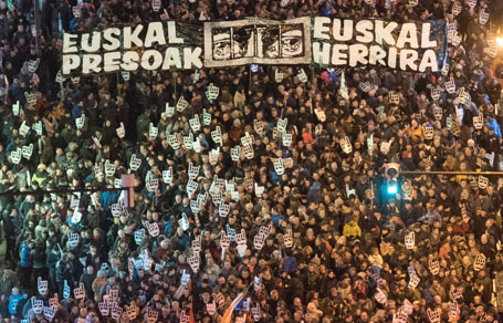 Decenas de miles se manifestaron este sábado en la ciudad vasca de Bilbao en demanda de que los cerca de 350 miembros encarcelados del grupo ETA, partidarios de la independencia del País Vasco, puedan cumplir sus penas cerca de su región nativa. Además de allegados a los presos, por primera vez participaron en la marcha familiares de víctimas del grupo Euskadi Ta Askatasuna (ETA) Foto Afp