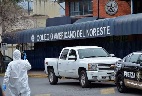 Un investigador toma imágenes del exterior del plantel privado de Monterrey en el cual un alumno de primero de secundaria disparó contra su maestra y tres compañeros Foto Ap