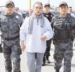 Mario Villanueva Madrid es escoltado por agentes de la Interpol tras su arribo y entrega en el aeropuerto capitalino Foto PGR