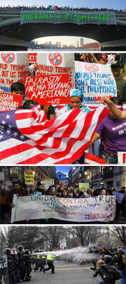 Miles se manifestaron en varias ciudades de Estados Unidos y de otros países en repudio al multimillonario que ayer asumió la presidencia. En territorio estadunidense, las principales movilizaciones tuvieron lugar en Los Ángeles, San Francisco, Oakland y Washington (cuarta imagen); en esta última urbe el saldo fue de más de 217 detenidos. También hubo protestas en Londres, Manila y Madrid (imágenes de arriba a abajo). En México salieron a las calles en al menos ocho ciudades Fotos Ap, Notimex y Afp