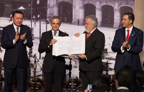 Miguel Ángel Osorio Chong, secretario de Gobernación; Miguel Ángel Mancera, jefe de Gobierno de la Ciudad de México; Alejandro Encinas, presidente de la Constituyente, y Pablo Escudero, presidente de la mesa directiva del Senado, durante la ceremonia de entrega de la Constitución capitalina para su publicación. El acto se realizó en el Antiguo Palacio del Ayuntamiento Foto Cristina Rodríguez