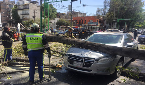 Por segundo día consecutivo, la Ciudad de México registró vientos que superaron 50 kilómetros por hora, lo cual provocó la caída de al menos 60 árboles, con lo que suman 120 en dos días, así como ramas y espectaculares, informó la Secretaría de Protección Civil. En ningún incidente hubo lesionados y sólo se registraron daños en algunos vehículos. La imagen, en Eje Central y Morena, donde elementos del Cuerpo de Bomberos retiraron un tronco de por lo menos 15 metros de largo Foto Víctor Camacho