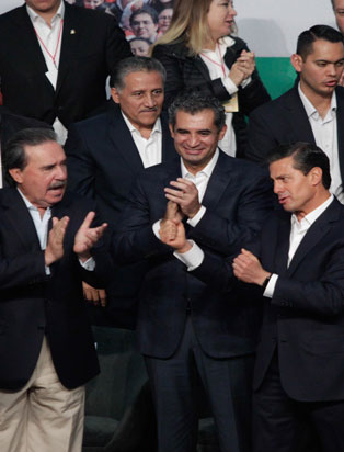 En la fiesta por el 88 aniversario del Revolucionario Institucional, militantes, alcaldes, gobernadores, políticos jóvenes y de viejo cuño, así como miembros del gabinete, prodigaron respaldo al presidente Enrique Peña Nieto. En la imagen lo acompañan Emilio Gamboa, coordinador de la bancada en el Senado; Arturo Zamora, líder de la CNOP, y el dirigente nacional del partido, Enrique Ochoa Reza Foto Yazmín Ortega Cortés